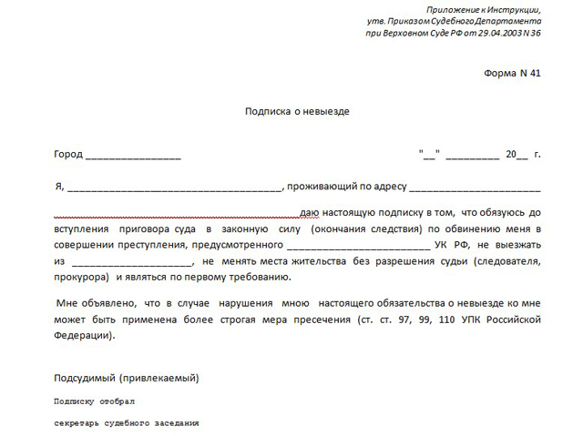 - Уполномоченное лицо производит отобрание подписки о невыезде после проставления на ней подписи обвиняемого или подозреваемого.